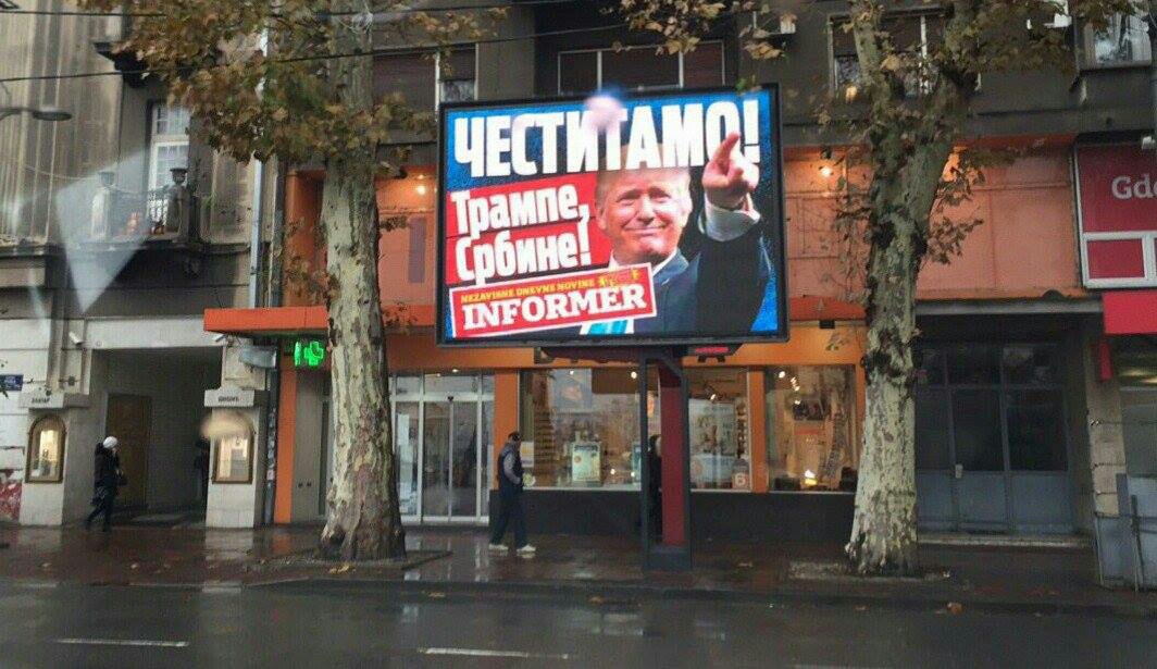 Kanalizacioni odvod zvani “Informer” je, na vest o pobedi Trampa, postavio nekoliko bilborda u Beogradu: “Čestitamo! Trampe, Srbine”, sa potpisom redakcije “Informera”, tog doušničko-udbaškog biltena, omiljenog štiva Aleksandra Vučića.